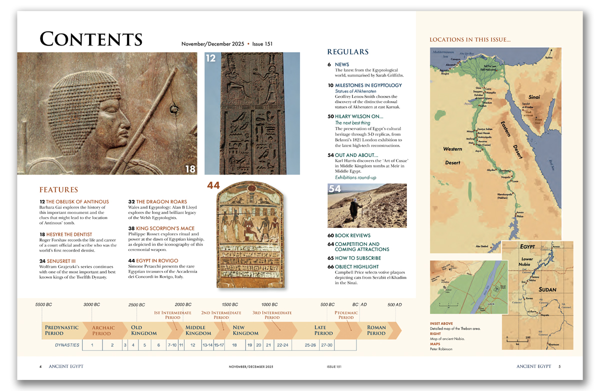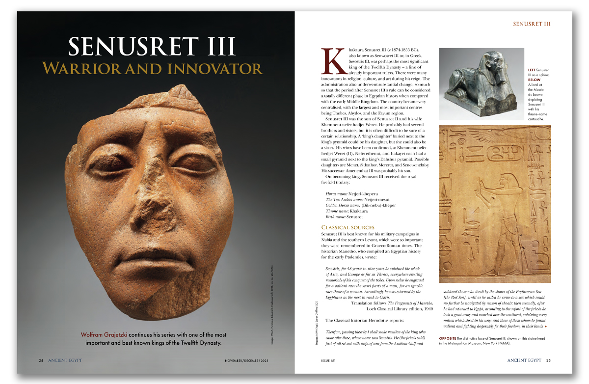 In AE 150, there were several articles that illustrated lesser known but important aspects of Egyptology, and AE 151 continues that theme. Simone Petacchi visits a museum near Venice that contains unique artefacts that are never seen by the general public; Karl Harris takes a trip to tombs in Meir where cobras guard the path; an obelisk dedicated to Hadrian’s lover Antinous rather than a pharaoh is described by Barbara Gai; and former dental surgeon Roger Forshaw describes the unique wooden panels that depict the world’s first known dentist Hesyre. Senusret III, on the other hand, is one of the most significant kings of the Twelfth Dynasty, and was still seen as an inspiration nearly 2,000 years later.