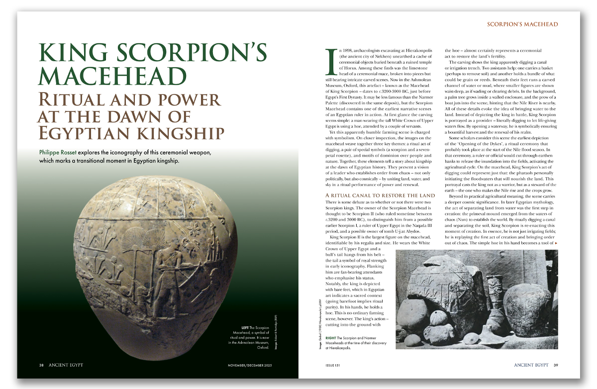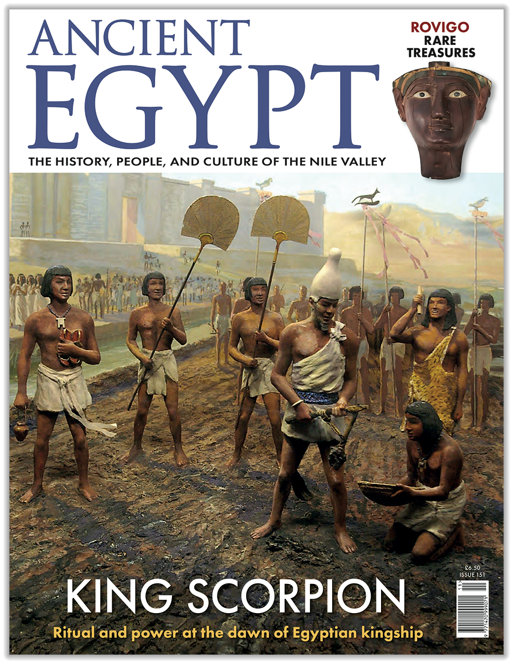 In some ways the Scorpion Macehead that was found at Hierakonpolis, in the same location as the more famous Narmer Palette, is just as important in informing us about the earliest history of the ancient Egyptian civilisation. King Scorpion (so-called because of the scorpion hieroglyph that labels him on the macehead) is shown in the act either of digging an irrigation ditch, or of breaking the wall of a canal and allowing the stored water to flood a field. As Philippe Rosset tells us in his article, the symbolism of this act is difficult to underestimate. It shows that the structure of the state with the pharaoh at its head was firmly established, and that state control of the system of irrigation which made agriculture flourish in a desert environment had been formalised. The diorama featured on the cover of this issue brings vividly to life the scene depicted on the macehead.